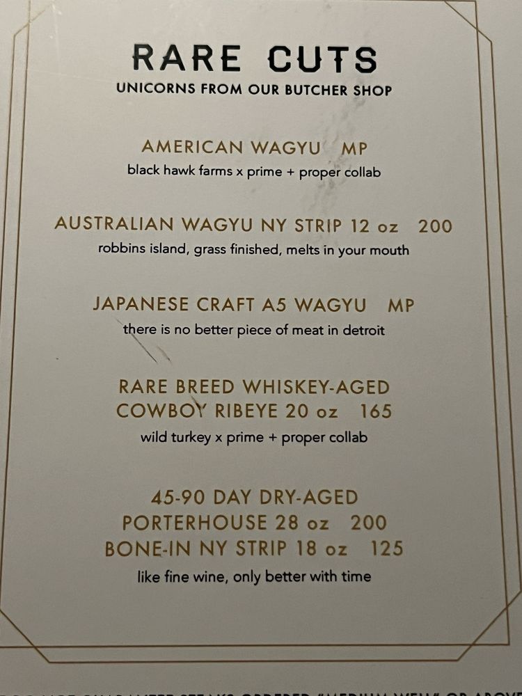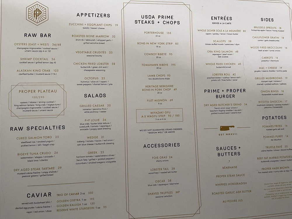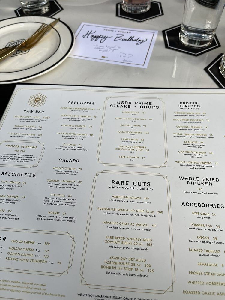 Introducing the menu at Prime and Proper, a classy and upscale restaurant in Detroit that offers a range of options for various preferences. From keto options to limited vegetarian dishes, this restaurant caters to a diverse clientele. The ambiance is trendy, intimate, and romantic, perfect for a special evening out. With attentive waiter service, a full bar, and happy hour specials, Prime and Proper ensures a memorable dining experience. Customers rave about the exceptional dishes like the filet mignon with whipped horseradish sauce and the bone marrow. Seafood options such as lobster and branzino are always top-notch, and the fried lobster receives special mention. The staff, including servers like Indra, Joe, and Kenny, goes above and beyond to make every guest feel welcome. Valet parking and free Wi-Fi add to the convenience of dining at Prime and Proper.